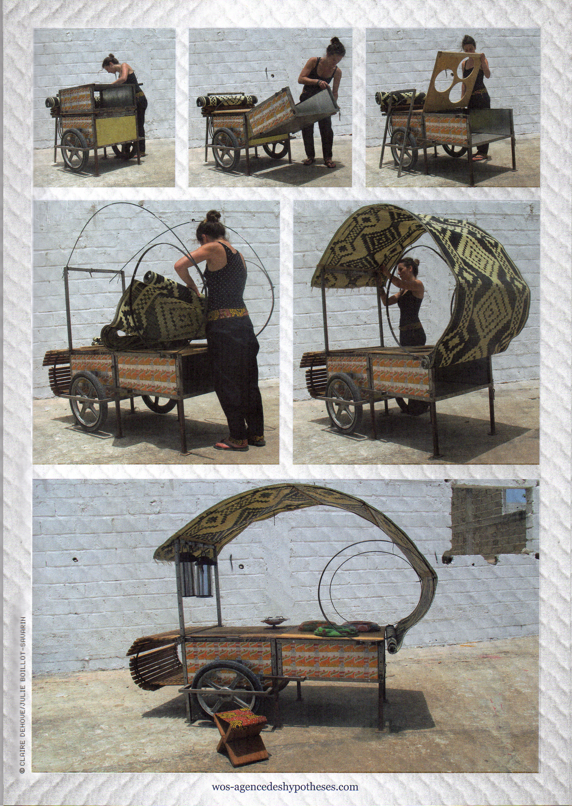 Les prototypes ont été réalisés pendant la résidence de WOS à Dakar, à partir des modélisations d’un KIT de construction conçu selon le principe modulaire du jeu de Meccano. Ce « Kit d’Ambulantage », diffusé en open source, propose des principes d’assemblage et une boîte à outils à partir desquels chacun cherche librement la configuration adéquate à ses besoins spécifiques. Une fois la construction du module de base achevée, chaque étal est personnalisé avec ingéniosité, par recyclage, habillage et customization.