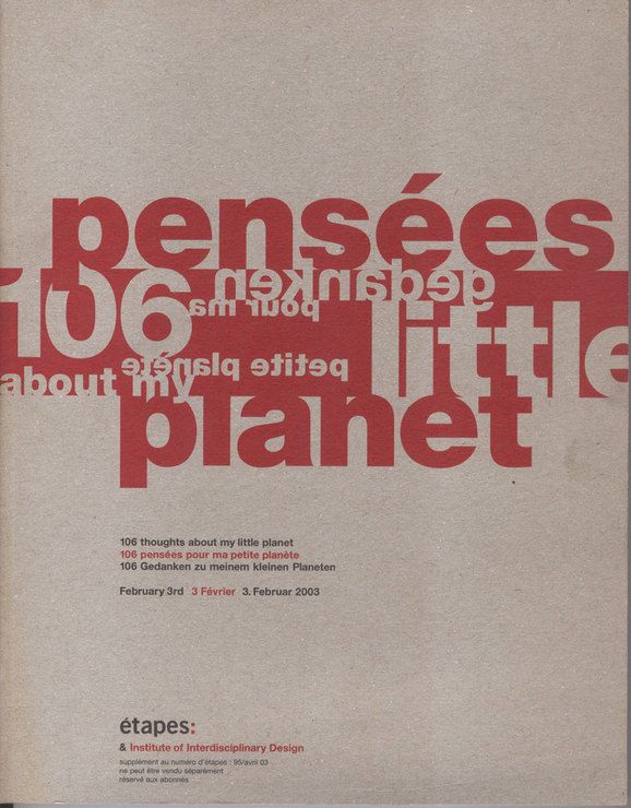 Space is spared, controlled…, Claire Dehove, in 106 pensées autour de ma petite planète, sous la direction de Ruedi Baur, Étapes Graphiques et Institut of Interdisciplinary Design, Leipzig, Allemagne, Paris, 2003