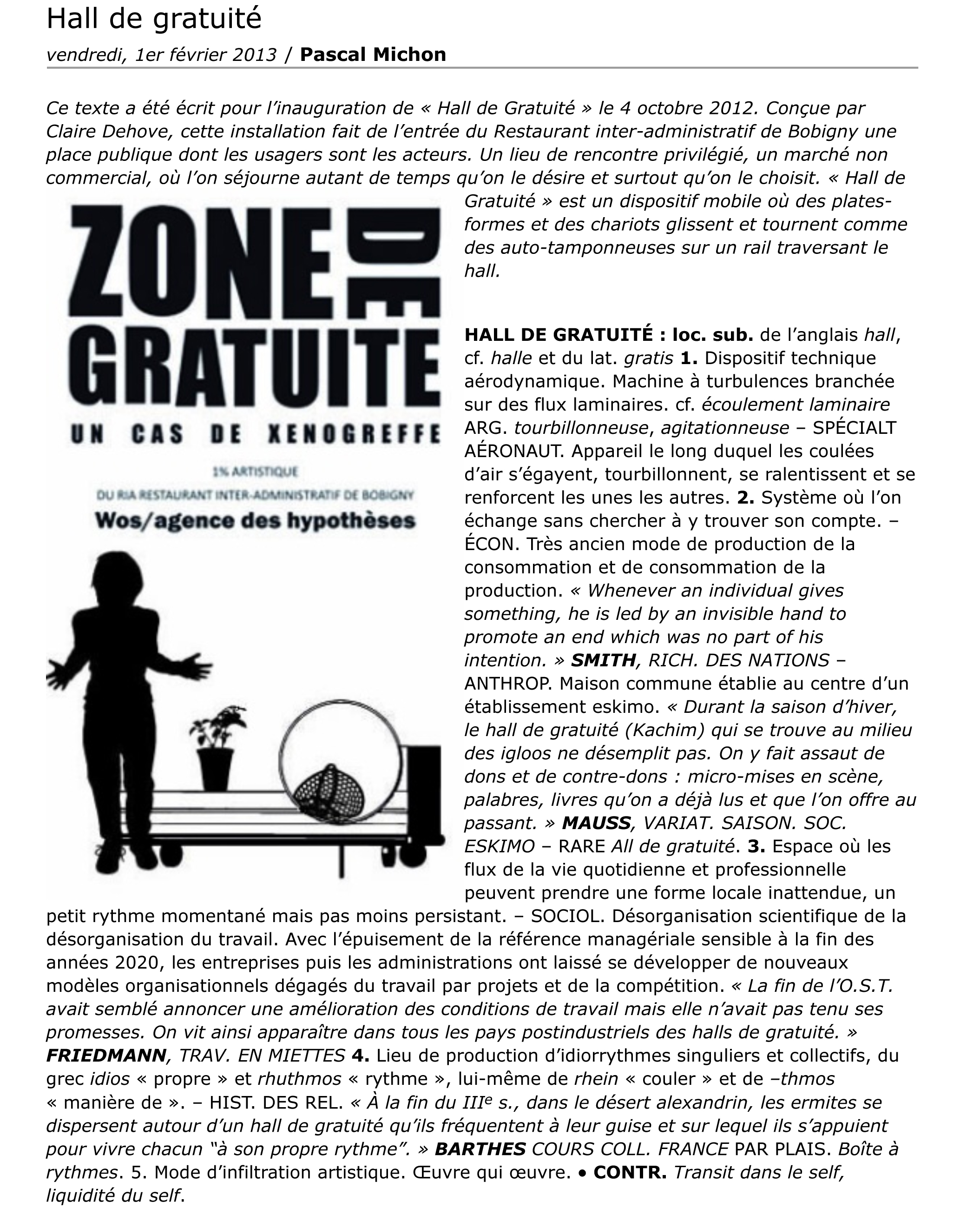 Pascal Michon , « Hall de gratuité », Rhuthmos, 1er février 2013 [en ligne]. http://rhuthmos.eu/spip.php?article802